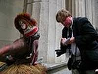 Tourists watch in utter amazement, jaws open, happy snap cameras going full speed and filling up mega pixels with images of the shaman. Fingers point, and people talk because you know full well that you can't find this kind of action in Des Moines, Iowa! And some ignore the man with the painted face and grassy skirt, rolling their eyes while does his voodoo...that voodoo, that he do, so well. This is no sideshow, no sir, Agassi F. Bangura is from Sierra Leone, Africa, and he came here to the site of the New York Stock Exchange specifically to cast a positive voodoo spell called "Borro" to help lift the stock market, the financial institutions, and the traders and lenders, and borrowers out of the abyss.